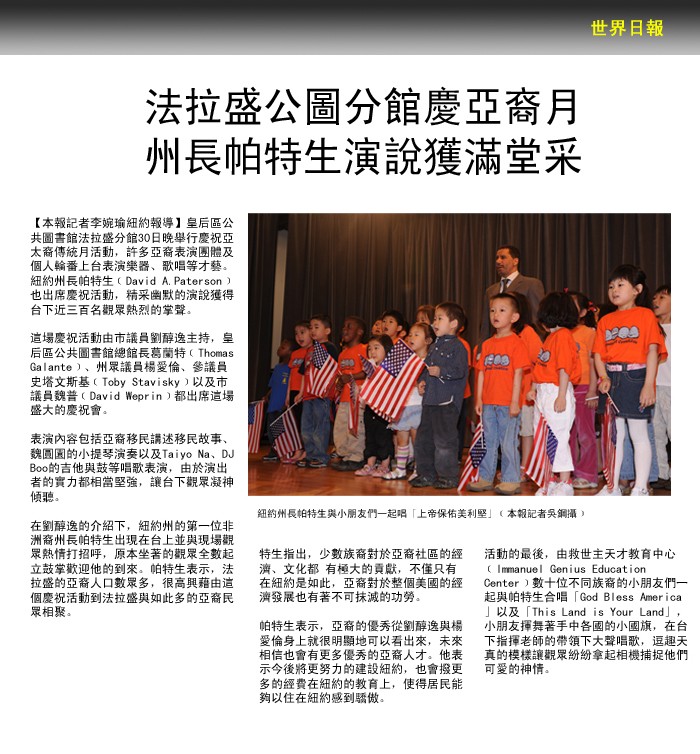 法拉盛公園分館慶亞裔月 州長帕特生演說獲滿堂彩