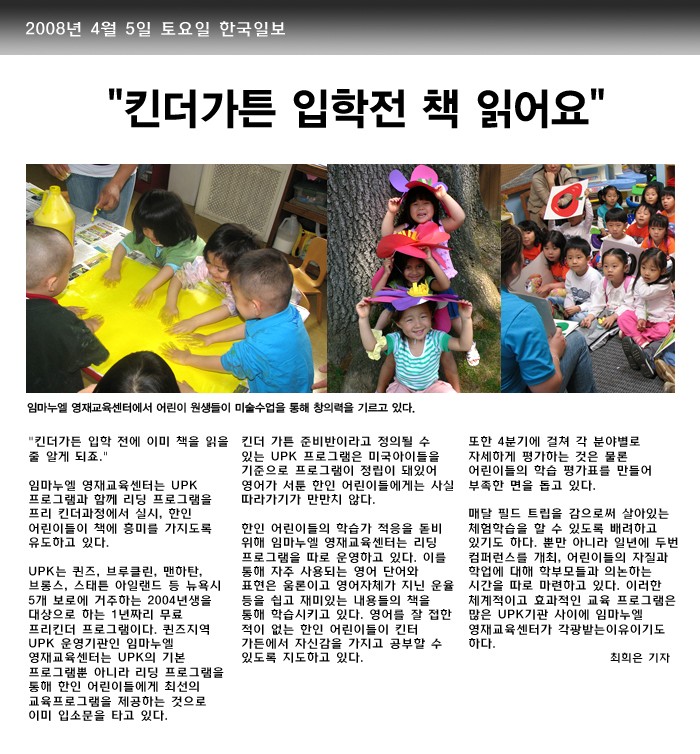 [한국일보] "킨더가튼 입학전 책 읽어요"